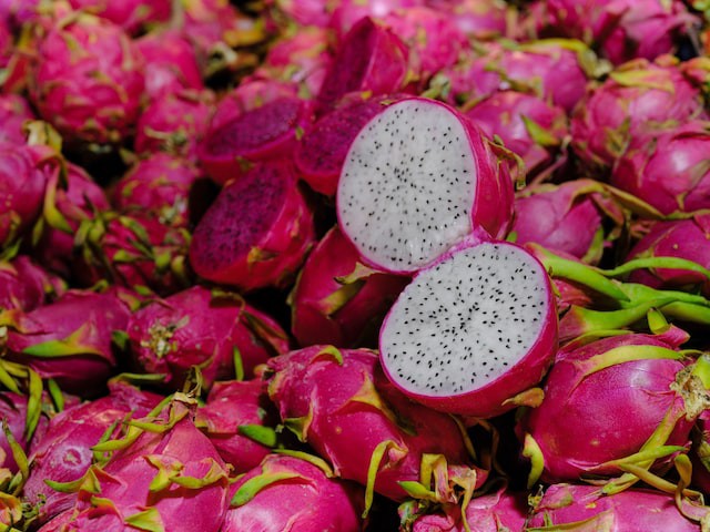 drakenfruit, ook wel Ik vraag pitahaya, of aardbei peer–behoort tot de cactusfamilie (cactussen). De bolvormige felroze vrucht staat bekend om zijn zoete, frisse smaak en unieke decoratieve uitstraling (de stekelige schubben geven het zijn naam). Drakenfruitvlees kan roze of wit zijn.